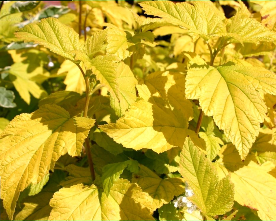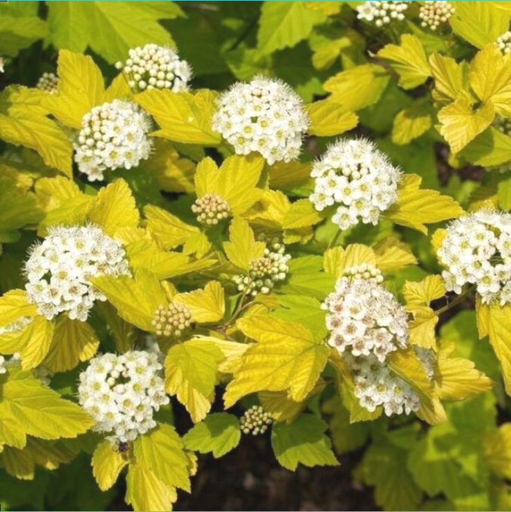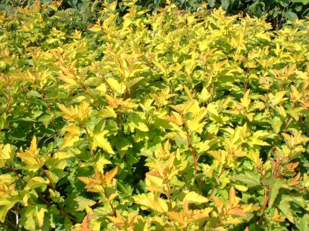 Взрослый куст высотой до 1,9 м и шириной около 1,7 м, округлой формы. Декоративен весь сезон за счет меняющейся окраски листвы. При распускании листья золотисто-желтые, к лету приобретающие лаймовые оттенки. На этом выразительном фоне в мае-июне появляются белые соцветия, эффектно контрастирующие с листвой. К августу листья приобретают салатовые цвета, а к осени опять возвращаются к насыщенному ярко-золотому цвету. Для сохранения окраски и контрастности листвы сажать нужно на солнечные участки.