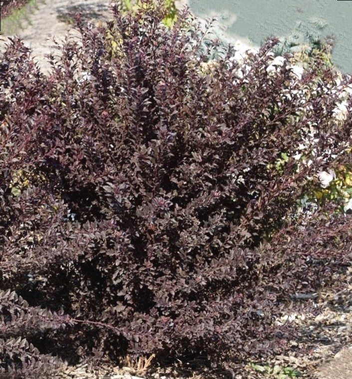 Взрослый куст высотой и шириной до 1,2 м, округлой формы. Декоративен весь сезон за счет меняющейся окраски листвы. При распускании листья красные, быстро набирают сливовый, фиолетовый оттенок. На этом изумительном фоне в июне-июле выразительно вспыхивают бело-розовые соцветия, со слабым ароматом, сменяющиеся на ярко-красные семенные коробочки. В начале сентября начинается второе цветение. Осенью окраска листьев меняется на ярко-красную с пурпурными и фиолетовыми оттенками. Декоративность придают и ярко-алые побеги.