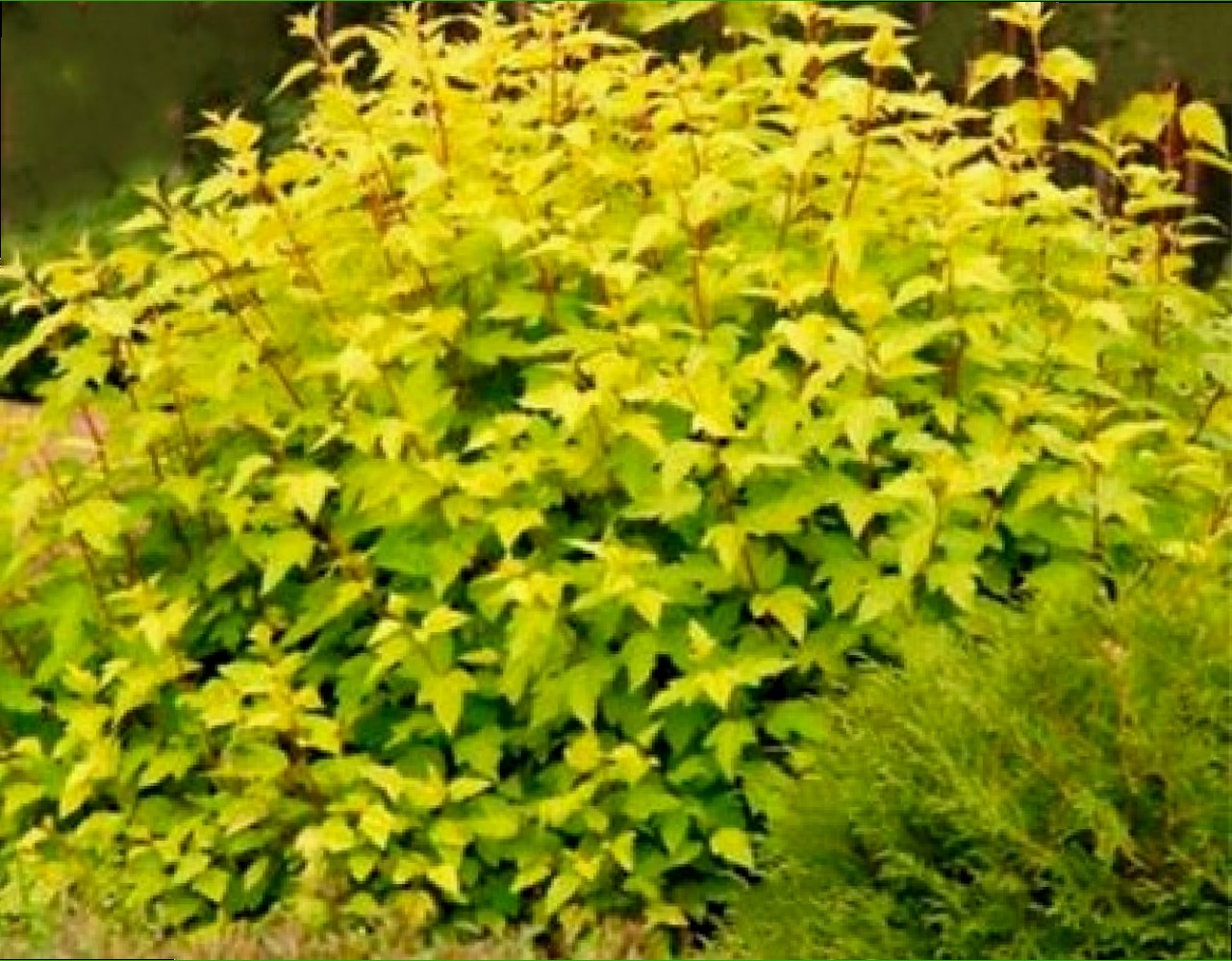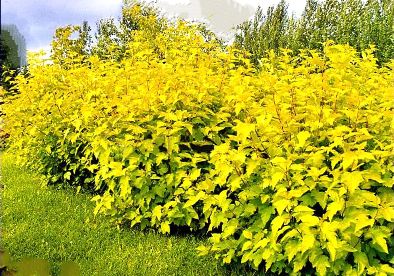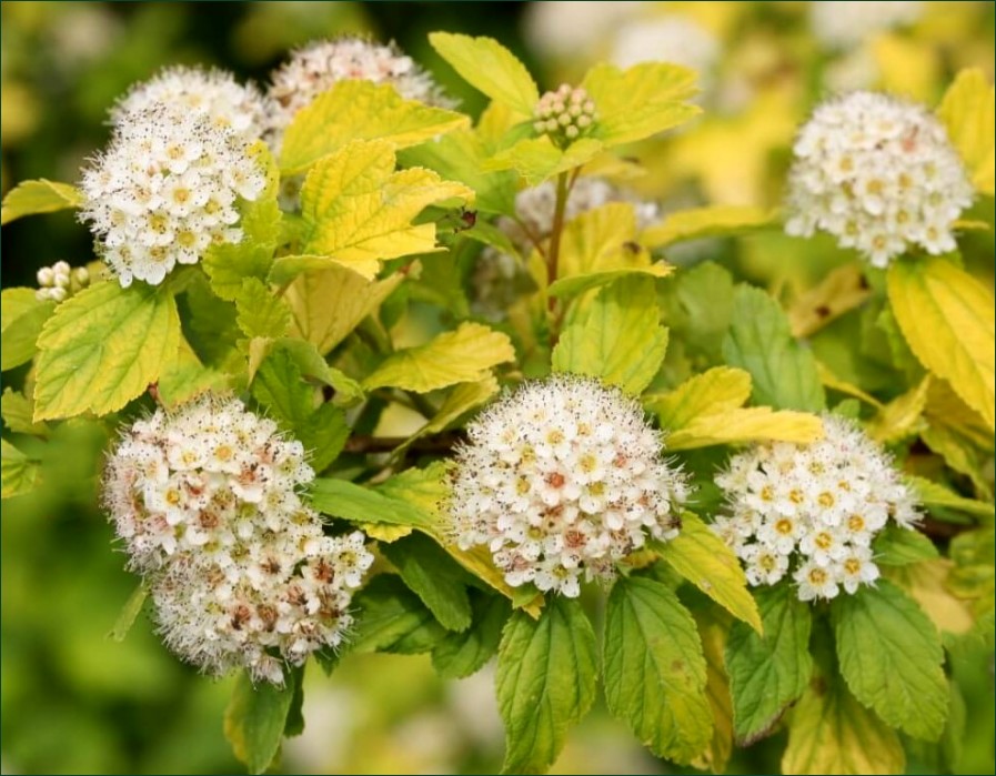 Взрослый куст высотой и шириной до 2,5 м, округлой формы. Декоративен весь сезон за счет меняющейся окраски листвы. При распускании листья нежного лимонно-лаймового цвета, с чудесной изюминкой в виде оранжевой окраски центра листа. К лету окраска становится салатовой. На этом фоне в июне обильно появляются белые соцветия, эффектно контрастирующие с листвой. К осени листья опять возвращаются к насыщенному ярко-золотому цвету с оранжевыми оттенками. Для сохранения окраски и контрастности листвы сажать нужно на солнечные участки.