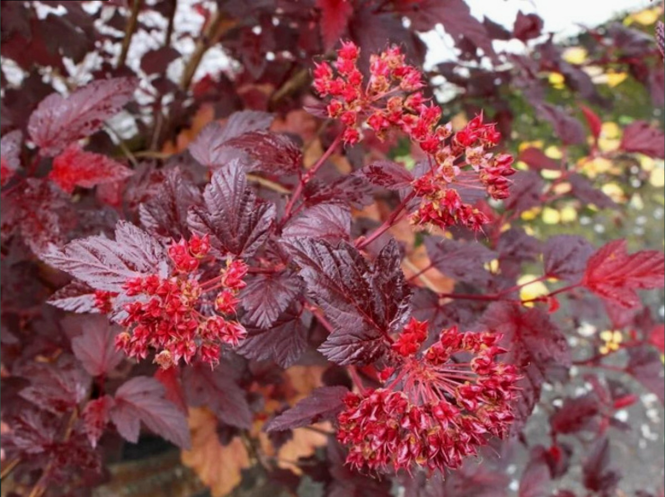 Взрослый куст высотой до 1,5 м и шириной до 1,2 м, округлой, овальной формы. Декоративен весь сезон за счет меняющейся окраски листвы. При распускании листья имеют богатую палитру от желто-зеленого с золотыми, оранжевыми и красными прожилками. К лету окраска меняется на темно-красную. На этом фоне в начале июня появляются бело-розовые соцветия, эффектно контрастирующие с листвой. К осени листья обретают насыщенно винные и бордовые тона. Для сохранения окраски и контрастности листвы – сажать нужно на солнечные участки.
