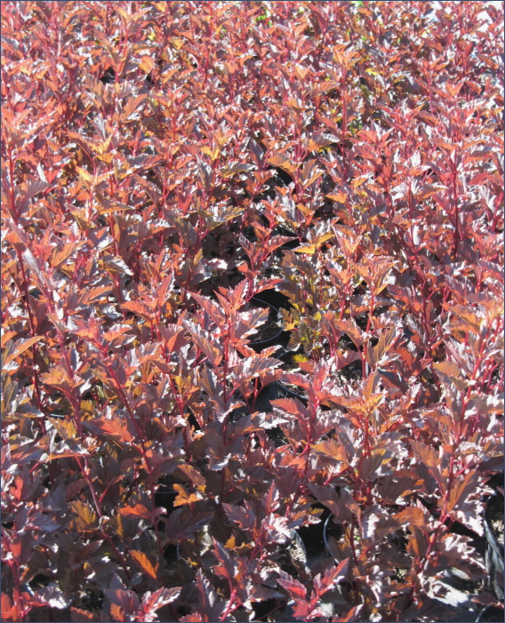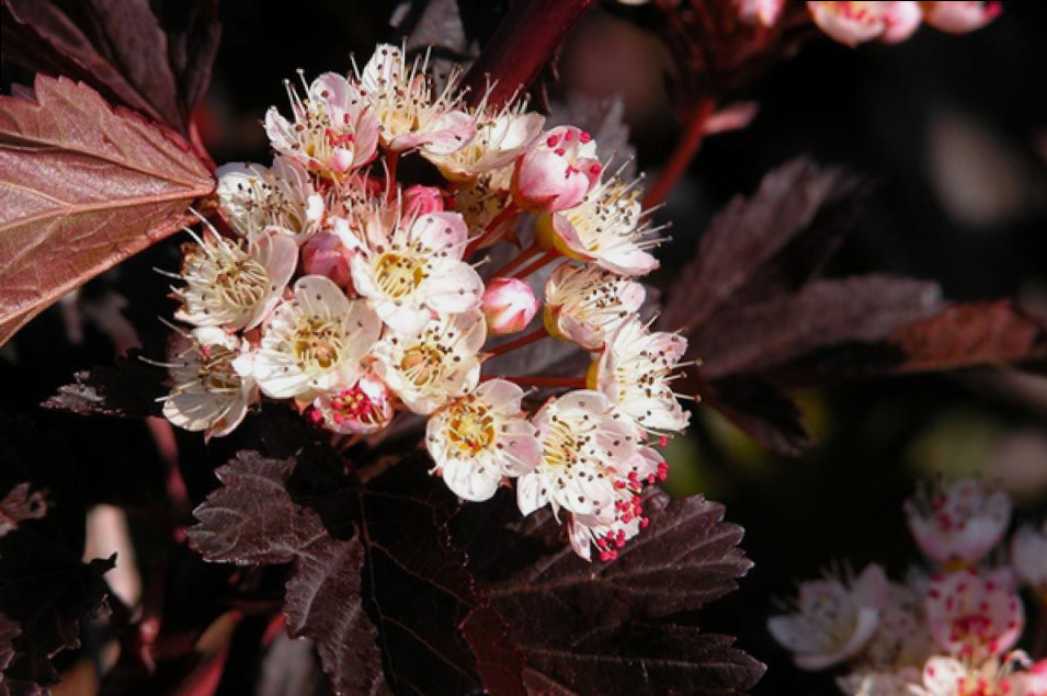 Взрослый куст высотой и шириной до 1,6 м, округлой формы. Декоративен весь сезон за счет меняющейся окраски листвы. При распускании листья трехцветные, быстро становятся винно-красными, к лету набирают пурпурный оттенок. На этом роскошном фоне в мае-июне появляются белые соцветия, обильно и по всей длине побегов. Осенью окраска листьев меняется на эффектную ярко-красную. Для сохранения окраски и контрастности листвы – сажать нужно на солнечные участки.